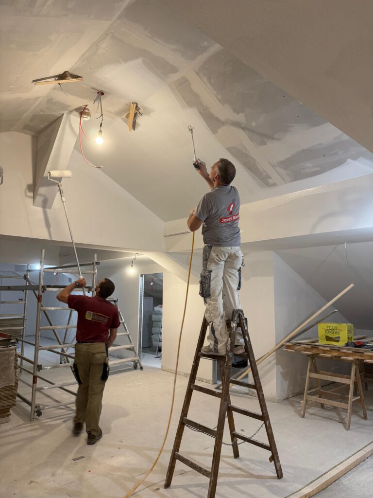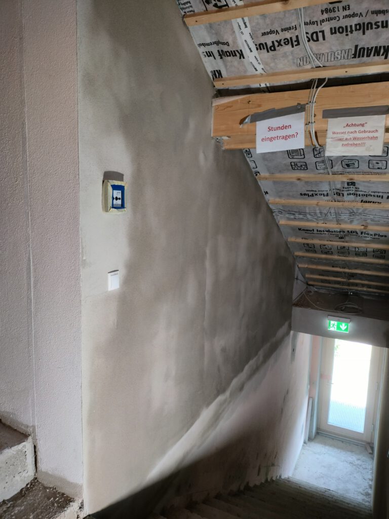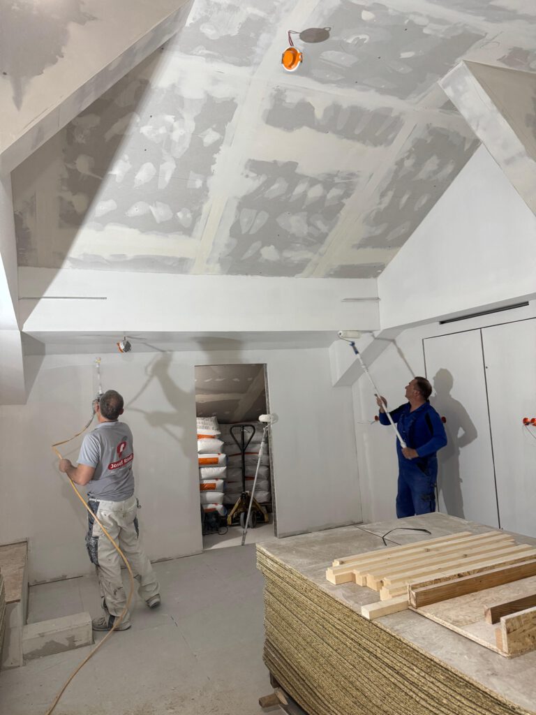 Sieht doch schon sehr wohnlich aus – oder? Der Deckenbereich wird dann mit einer Spritzmaschine mit Farbe versehen, die Wände werden auch nochmal überspritzt um letzte Unebenheiten auszugleichen. Das macht dann der Profi mit der Maschine.