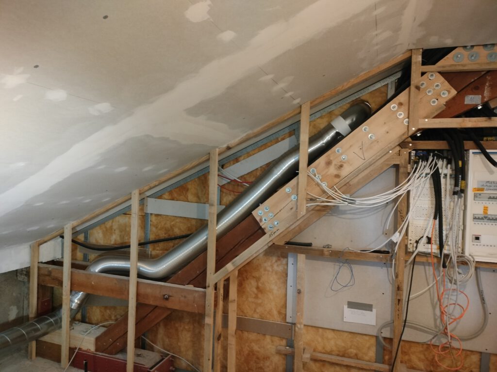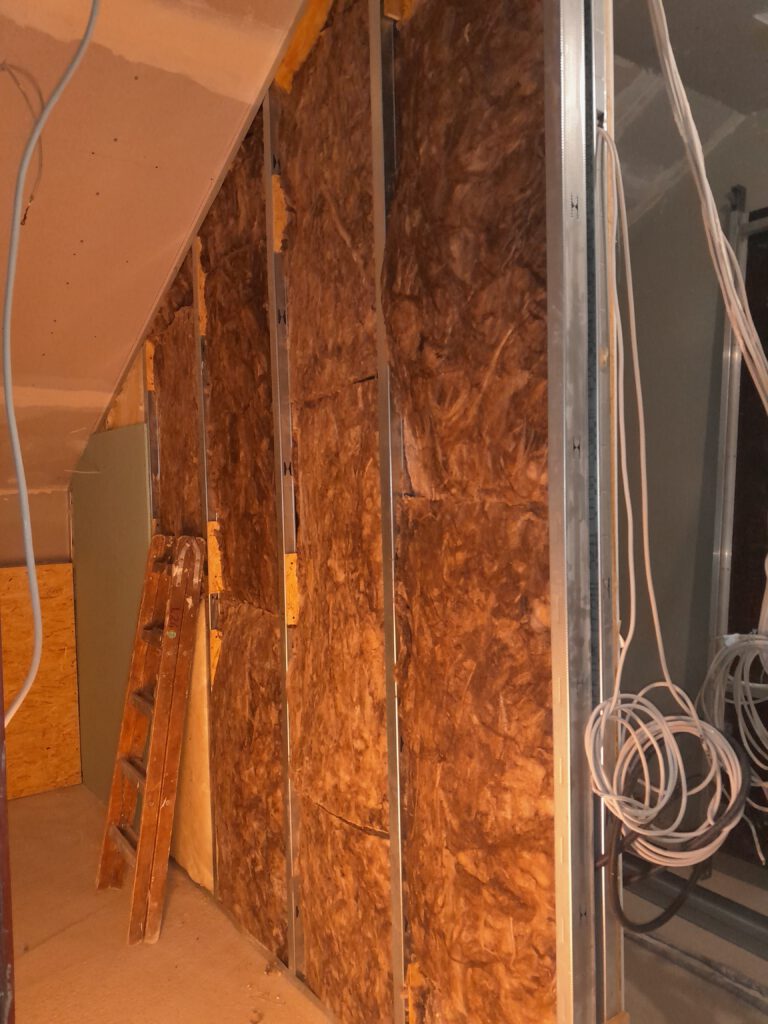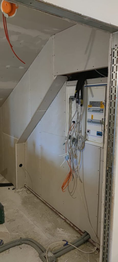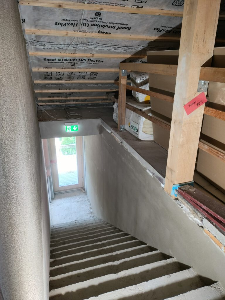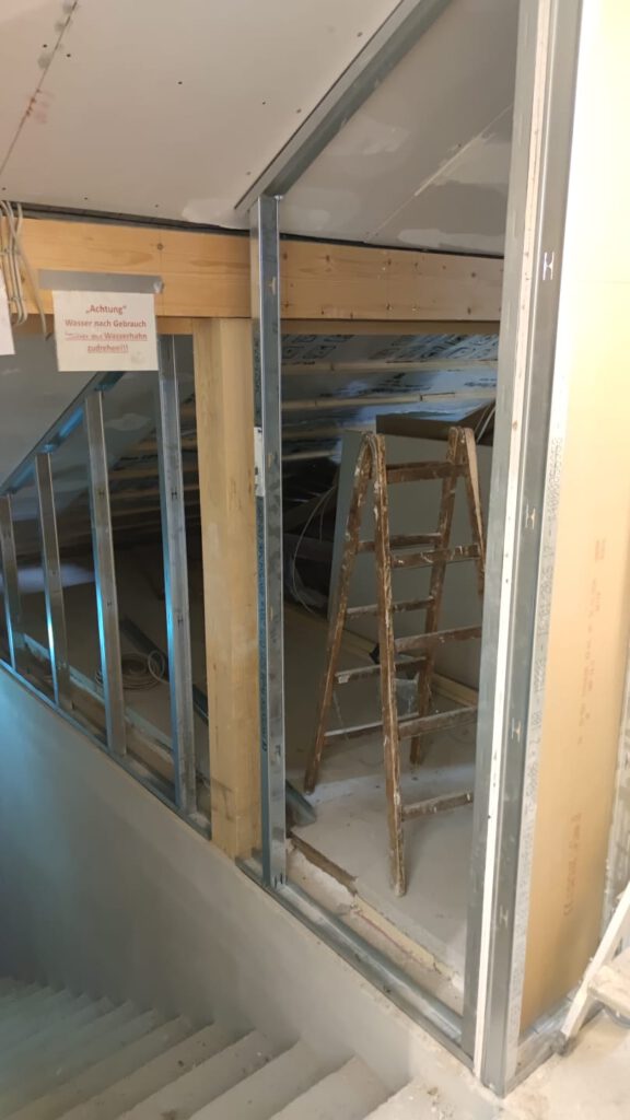 Am Gang nach unten entsteht noch ein Lager für die Schule. Wieder beplanken, spachteln, 2.Lage moniteren,isolieren…