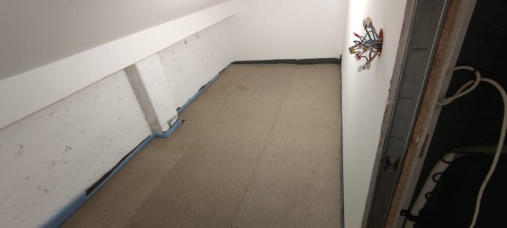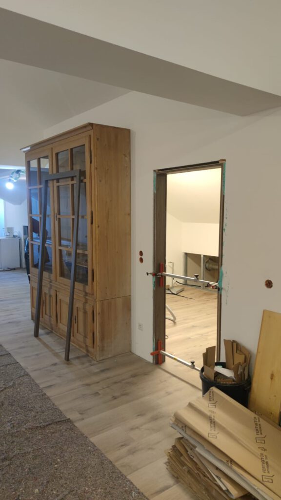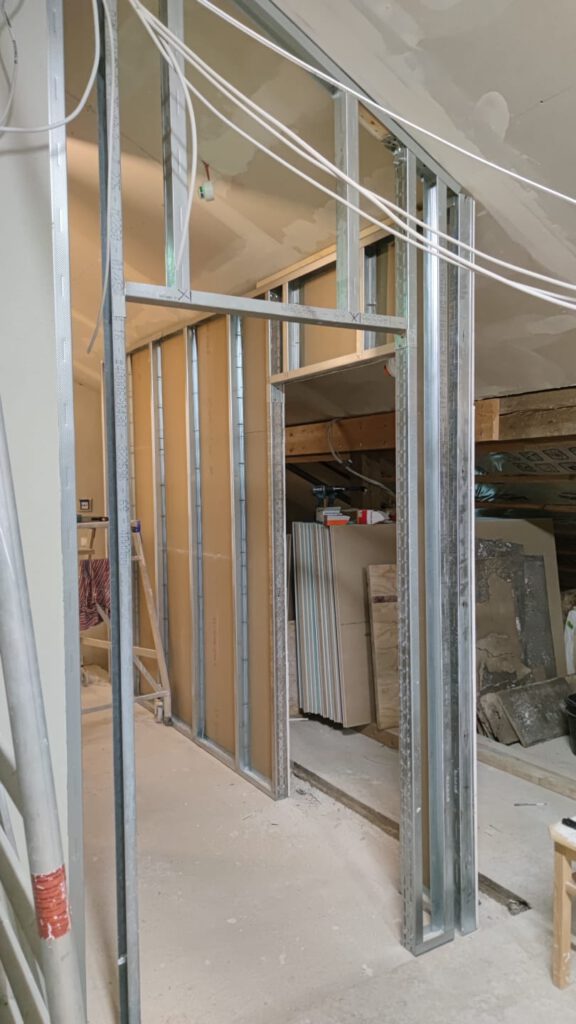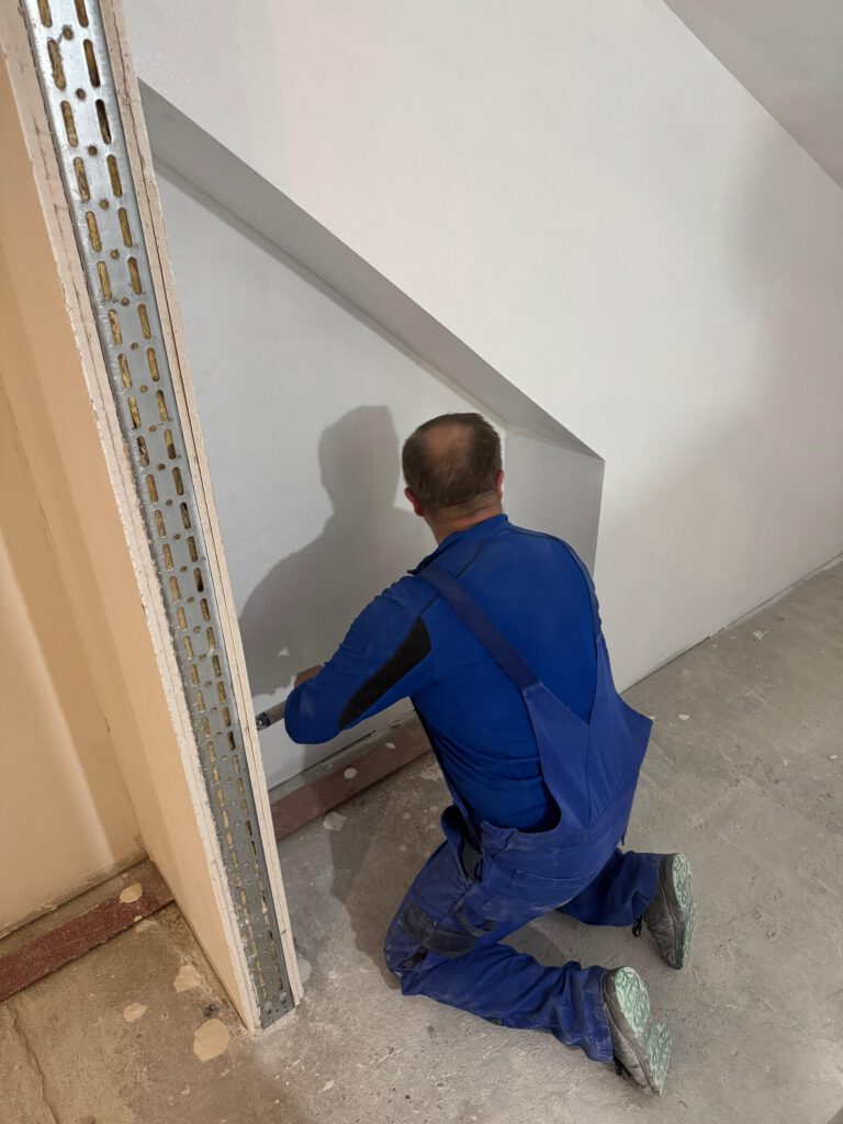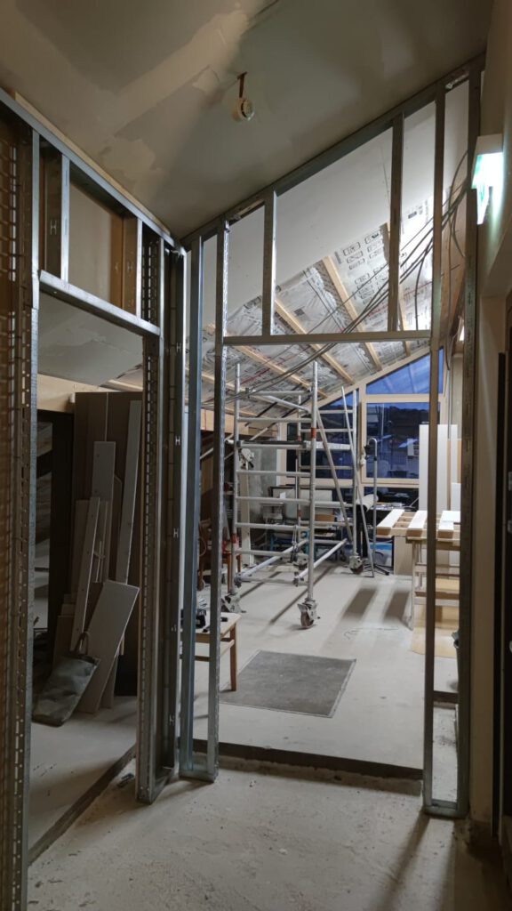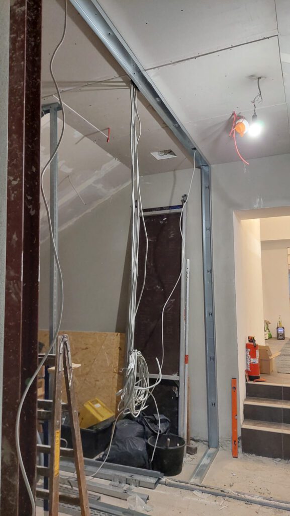 Am Gang nach unten entsteht noch ein Lager für die Schule. Wieder beplanken, spachteln, 2.Lage moniteren,isolieren…