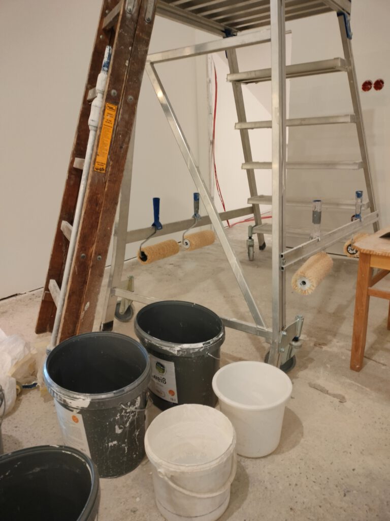 Mit diesem Gerät müssen alle Wände nach 2maligem Spachteln abgeschliffen werden, und das bei ca. 700 Quadratmetern! Die Kosten, wenn wir das Weißeln vergeben würden, übersteigt um ein Vielfaches das Budget, deshalb brauchen wir dringend Leute, die schon mal einen Pinsel in der Hand hatten! Tragt Euch fleißig in die Arbeitsliste für diese und kommende Woche ein!