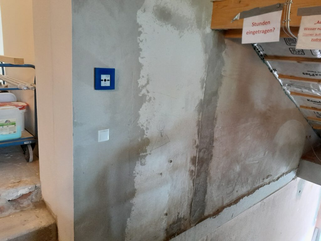 Mit solch einer Spachtel wurde der komplette untere Bereich von überschüssigem Gips befreit, man nennt das ” Fugen abstoßen”. Ganz schön schweißtreibende Arbeit, es gab einiges zu entfernen, wir sind ja alle keine Profis beim Fugen spachteln. Jetzt wird noch einmal gespachtelt und dann sind die Wände fertig zum streichen.