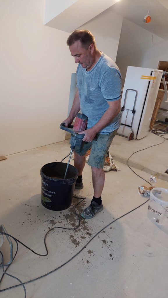 Ausgleichsmasse wird angerührt, auf dem nächsten Bild sieht man die verteilte Masse.