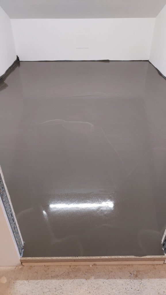 Der Boden im vorderen Bereich des Schießstandes wird mit Ausgleichsmasse aufgefüllt, damit kommende Woche der Boden weiter verlegt werden kann.