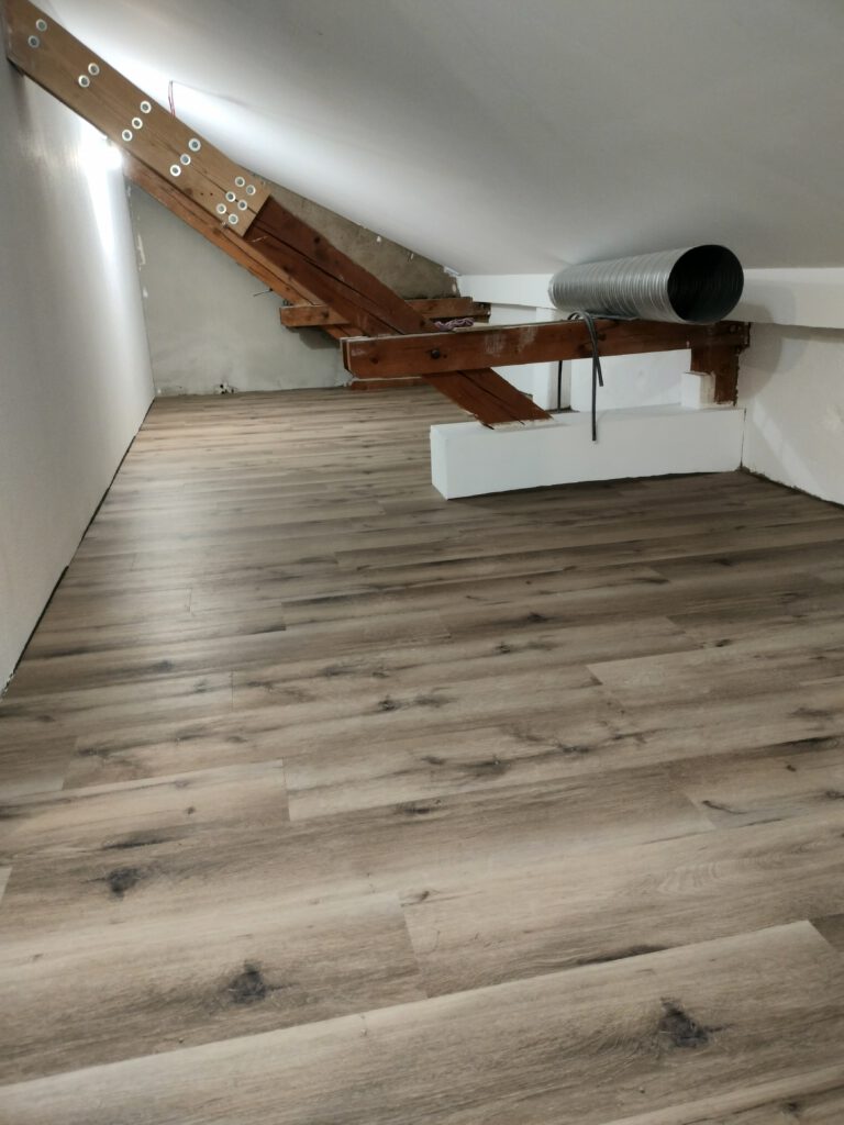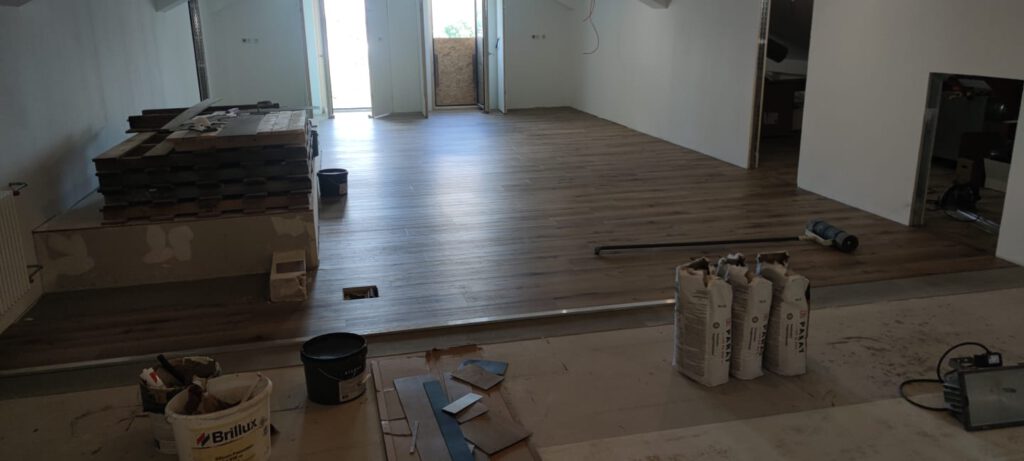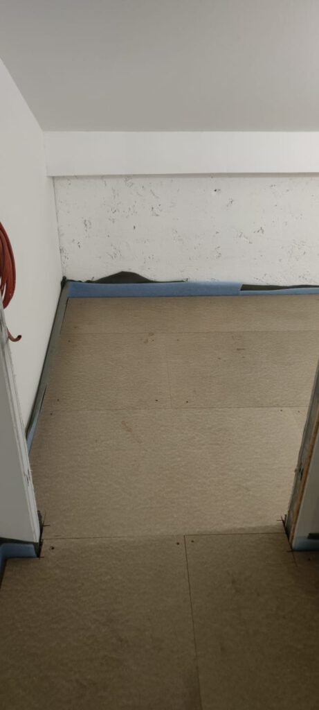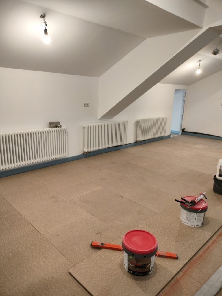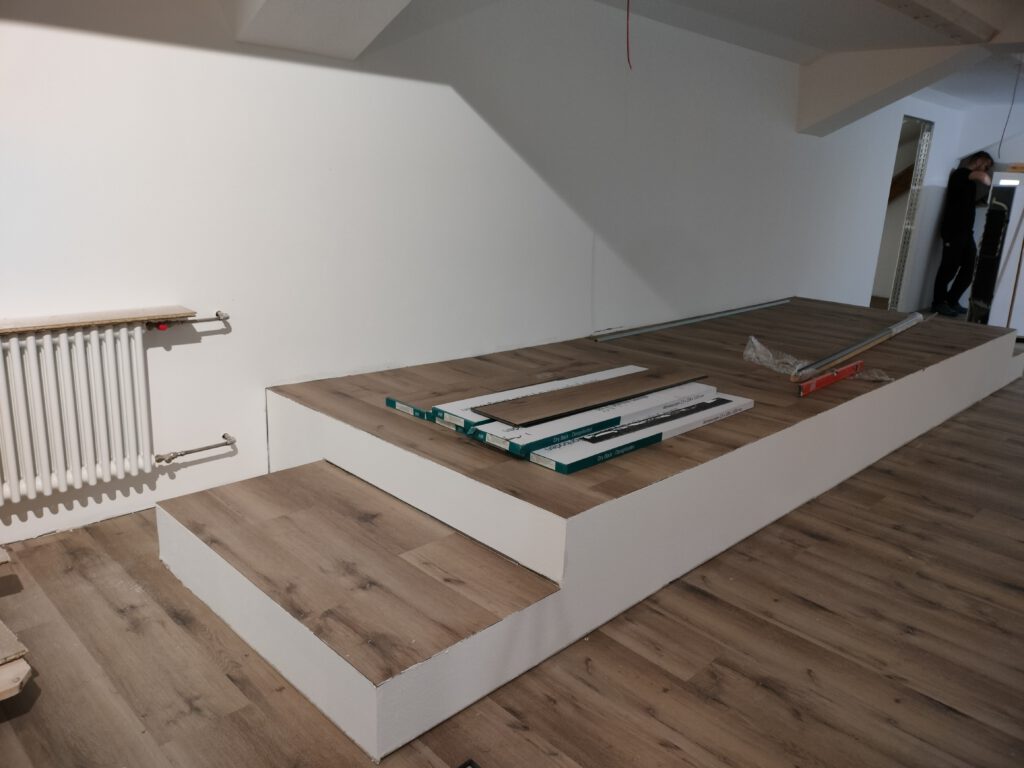 In den beiden seitlichen Dachräumen vorne hinter der Küche und in der zukünftigen Garderobe ist der Unterbau fertig.
