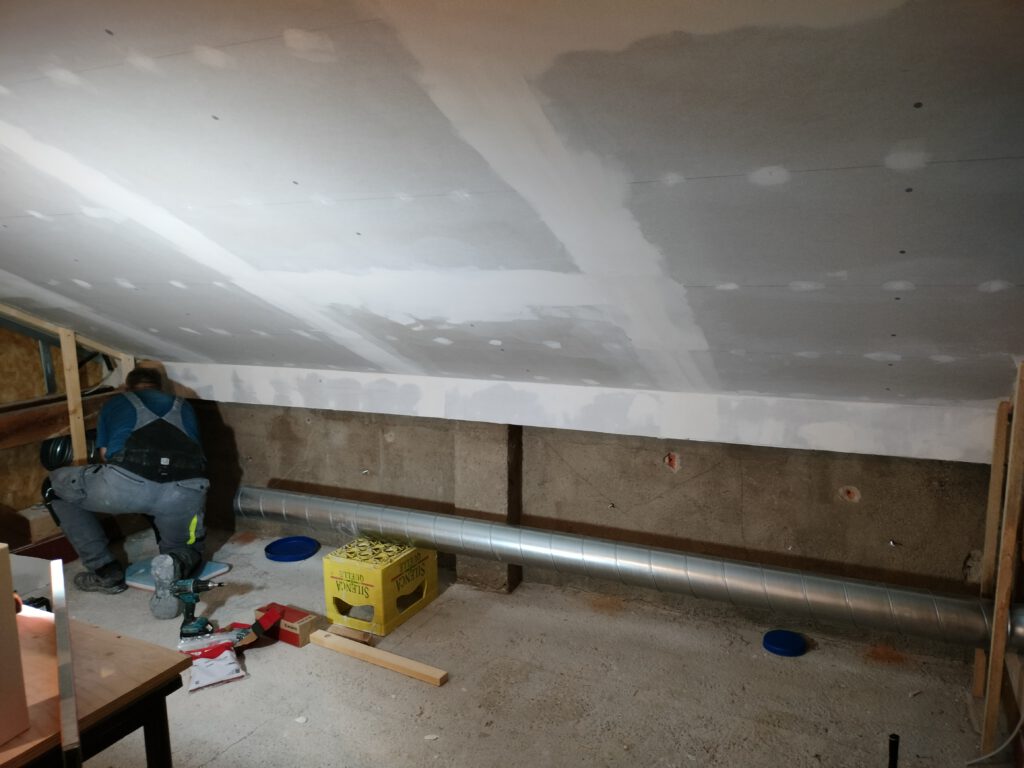 Am Wochenende wurde die letzte Platte montiert und die Eckschoner angebracht. Jetzt heißt es wieder spachteln, spachteln, spachteln. Am Freitag, den 20.12.2024 wollen wir die erste Wand aufstellen, damit die Räume so langsam Gestalt annehmen.