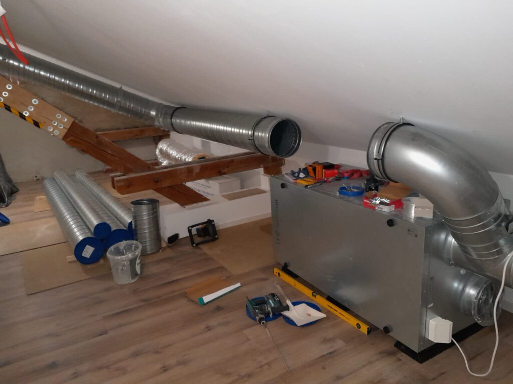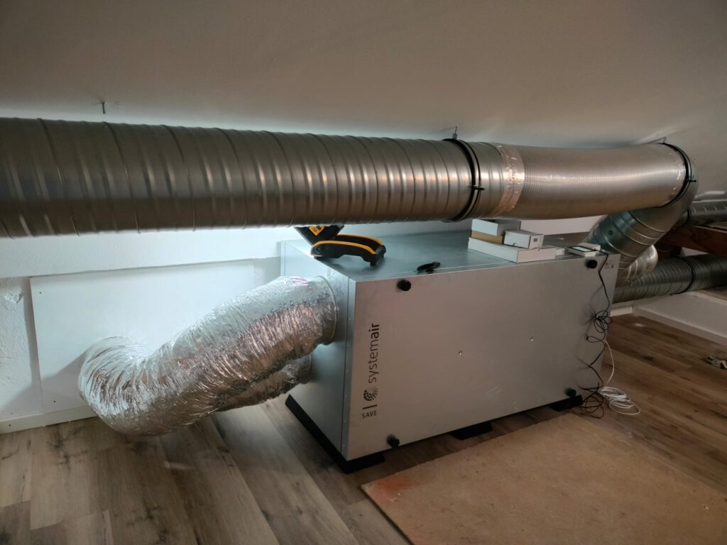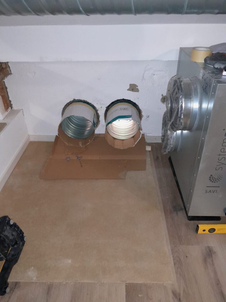 Es wurden 2 große Löcher in die Außenwand gebohrt und innen dann an das Lüftungsgerät angeschlossen.