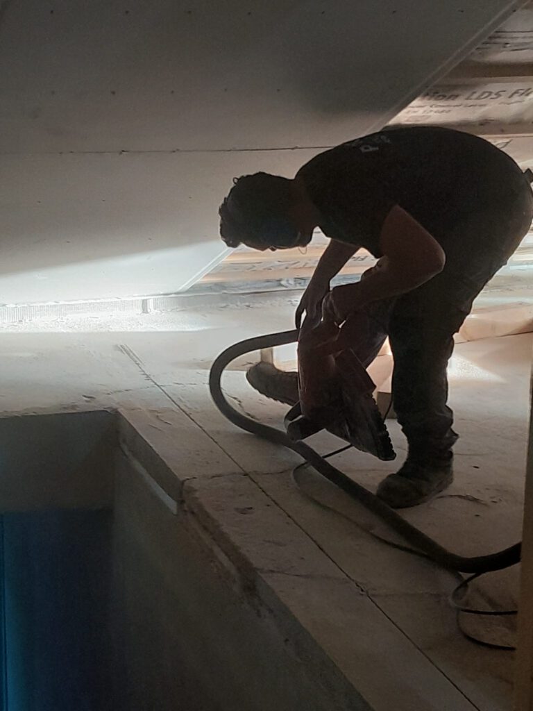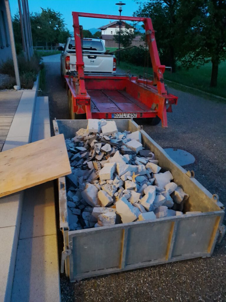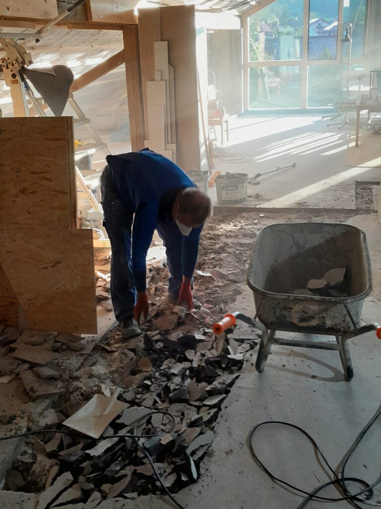 Der alte Estrich aus dem Bereich für die Schule muss rausgebrochen werden, nach unten transportiert und fachgerecht entsorgt werden. Das muss deshalb sein, weil die Wände aus brandschutztechnischen Gründen auf den Betonboden montiert werden müssen und keine Isolierschicht mit brennbarem Material darunter sein darf.