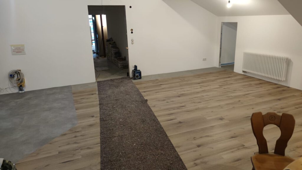 Der Fußboden auf dem Podest ist fertig verlegt, hier fehlen nur noch die Randleisten. Das Podest ist ein Relikt aus der Vergangenheit, hier war früher mal der Treppenaufgang, bevor die Schule saniert und erweitert wurde.