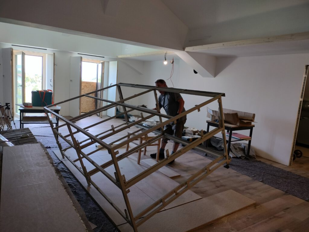 Wir sind mit dem Aufstellen der Innenwände fertig! Jetzt müssen noch ein paar Spachtelarbeiten gemacht werden und die Elektrik installiert werden – es sind Elektriker gefragt!!