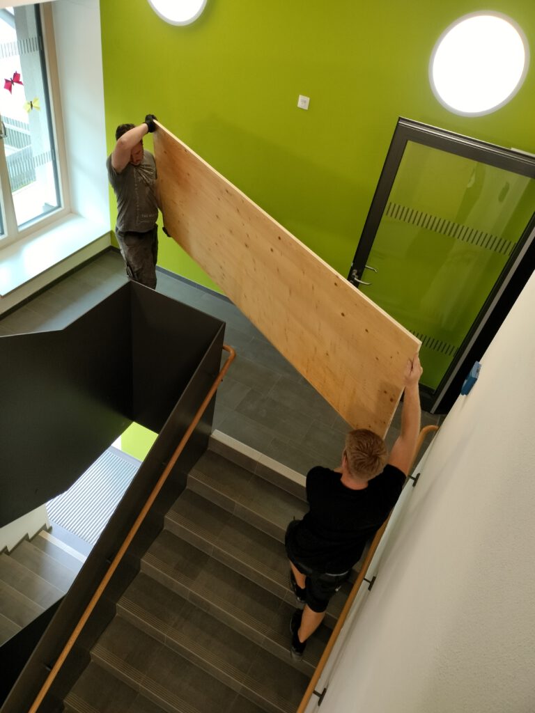 Am Freitag, den 06. September (kurz vor Schulbeginn) in der Früh um halb 8 liefert ein riesen LKW mit Kran die ersten 220 Gipskartonplatten. Ein schlauer Schütze wusste, dass dieser Kran die Paletten drehen kann und somit bis zu einem der oberen Fenster kommt, damit nicht alle Platten über das Treppenhaus einzeln getragen werden mussten. Dazu ist die Plexiglassicherung entfernt worden und somit konnte der Kran mit der Palette bis an das Fenster ran fahren.
