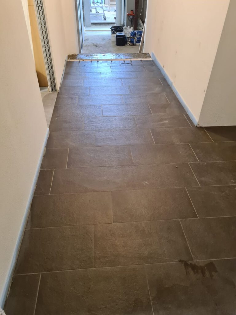 Der Flur ist fertig verfugt, jetzt müssen nur noch die Treppe und die WC Wände gefliest werden.
