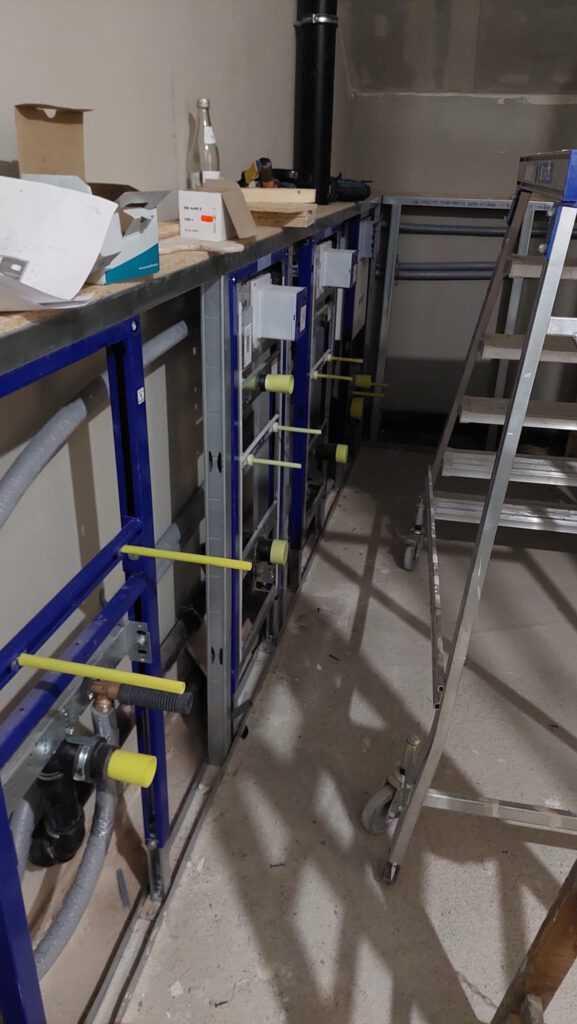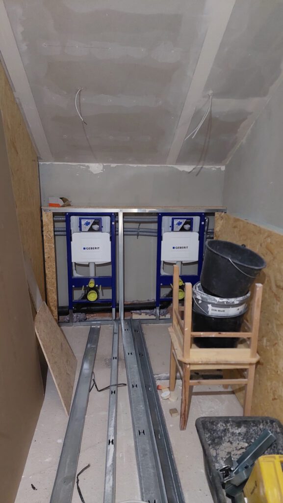Um die WC-Ständer, die die Installationsfirma montiert hat, werden die Trockenbauwände gestellt.