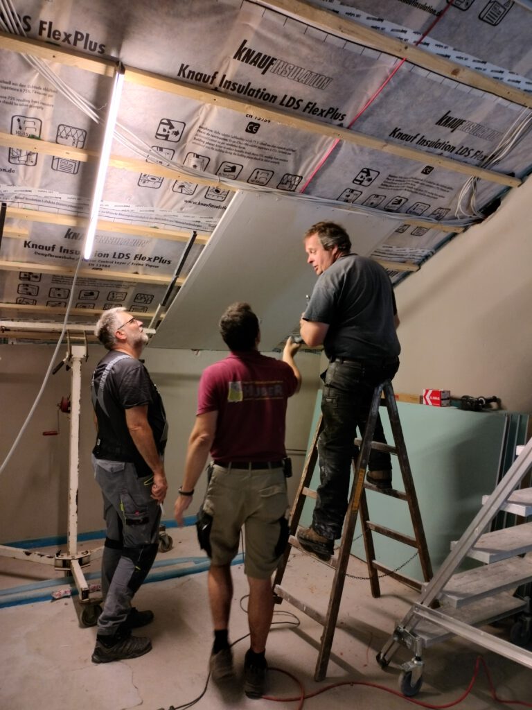 An diesen beiden Tagen werden weitere Gipskartonplatten montiert, auch im oberen Bereich des Dachstuhls. Die Temperaturen sind im Gegensatz zu den letzten Einsätzen heute erträglicher.