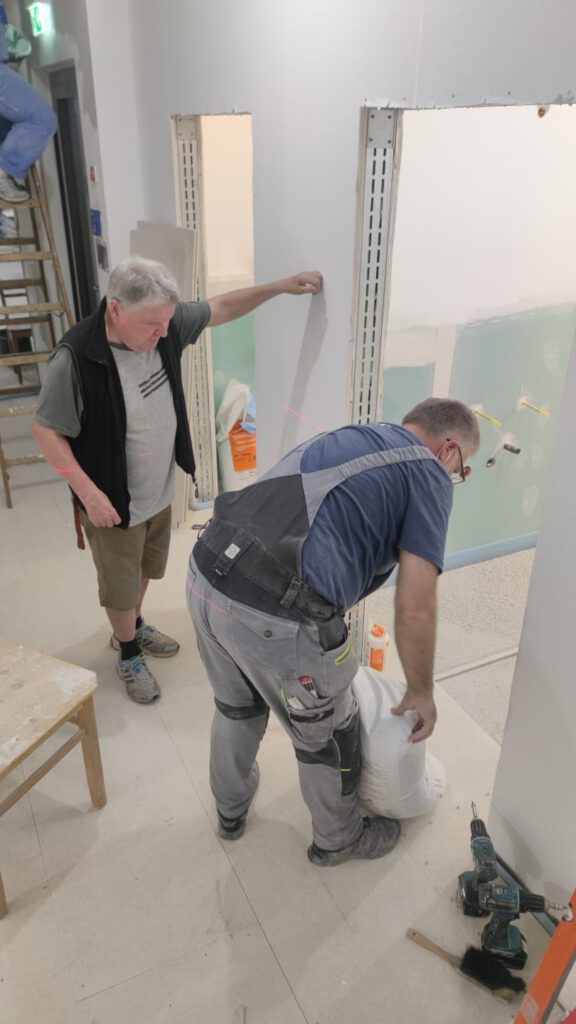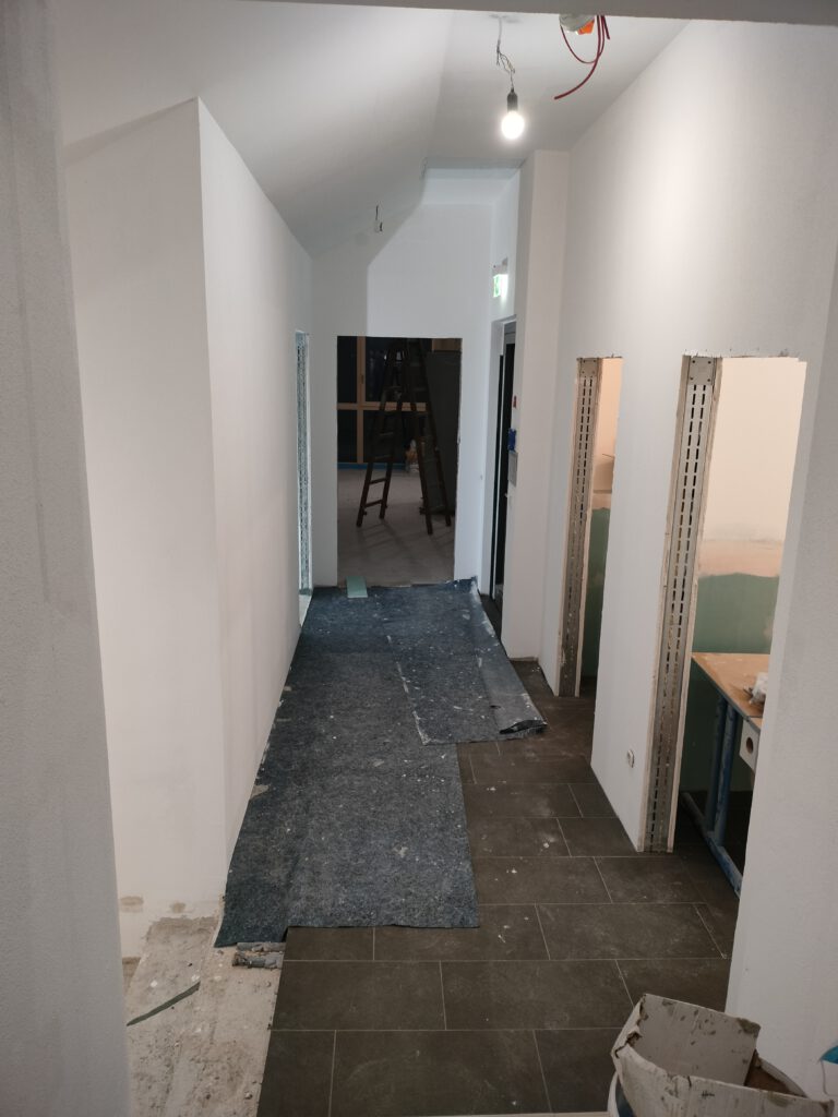 Im Büro ist die Elektroinstallation fast fertig, der Trockenbau ist gemacht, jetzt heißt es wieder mal spachteln und weißeln. Aber wir sind jetzt schon so eingearbeitet, dass das keine große Herausforderung darstellt.