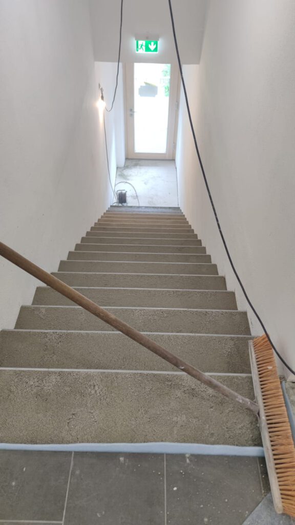 Die Treppe ist vorbereitet für die Stufenfliesen. Der Estrich und die stehenden Fliesen sind fertig!